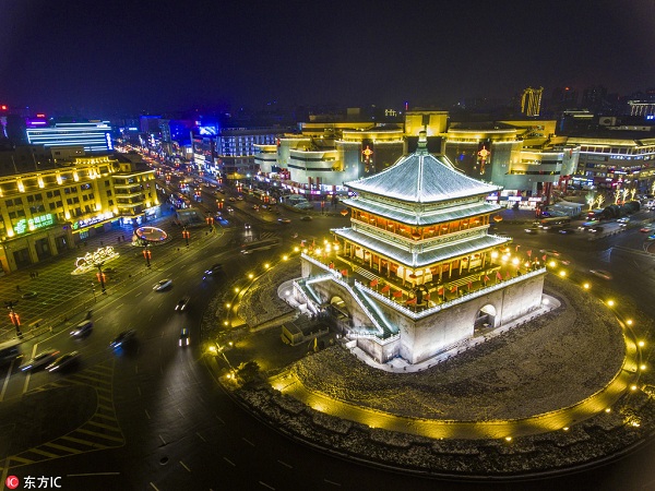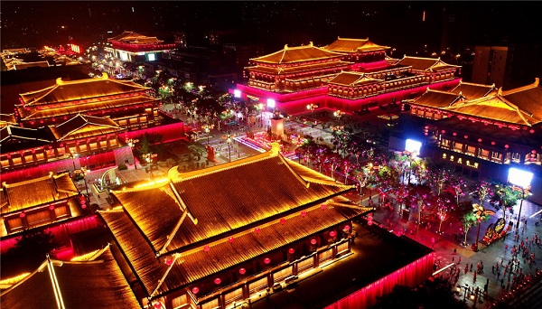Datang Everbright City is located at the foot of the Big Wild Goose Pagoda in Yanta district in Xi'an, capital city of Northwest China's Shaanxi province. Tourists flock to the streets for music shows and colored lanterns at Datang Everbright City. [Photo/Xinhua] It is one of the 11 in the first batch of pilot pedestrian streets, or pedestrian malls approved by the Ministry of Commerce. It covers an area of 650,000 square meters and has an annual passenger flow of over 10 million passengers. People visit Datang Everbright City in Xi'an. It also has the largest sculpture and landscape block in Asia and the first city block in the country to adopt payments by scanning faces. Taking the Tang Dynasty (618-907) culture as its design theme, the pedestrian street strives to create a one-stop consumer paradise that integrates shopping, dining, entertainment, leisure, tourism and business. Based on the Big Wild Goose Pagoda, it starts from Xuanzang Square in the north, Tang City Wall Heritage Park in the south, Ci’en East Road in the east and Ci'en West Road in the west. It runs through the three themed squares -- Xuanzang Square, Zhenguan Cultural Square and Kaiyuan Celebration Square. It has six imitation Tang blocks and four cultural buildings --Xi'an Concert Hall, Xi'an Grand Theater, Qujiang Movie City and Shaanxi Artists Gallery.