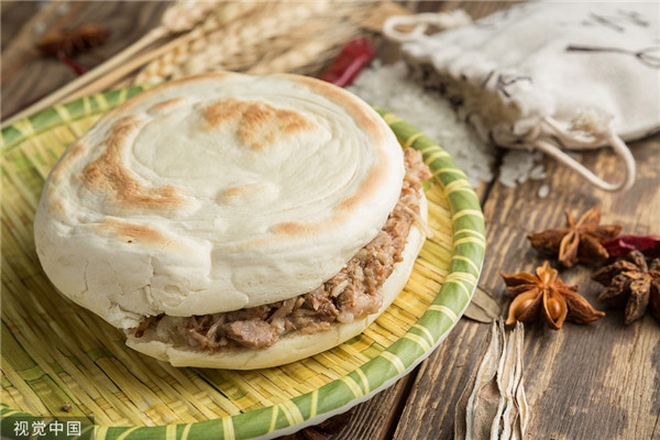 Xi'an marinated meat in baked bread is Shaanxi oil-sprayed noodles (youpo mian) famous as the "Chinese hamburger". Juicy meat is mixed with Baiji bread in a perfect match.